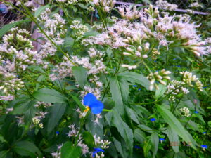作業中、野草圃場に、咲き出したフジバカマの花に早速アサギマダラが三頭飛来、