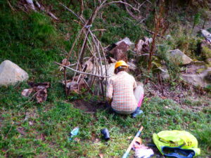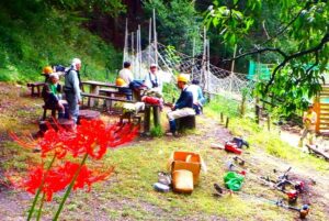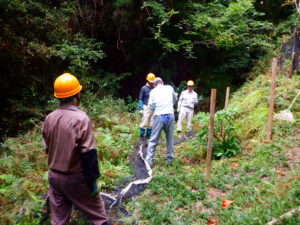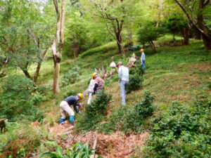 野草園奥の今春植栽したミツマタ周りの草刈りと防鹿ネット張り、園路の一部手直しなど、