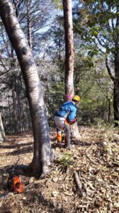 節句山の山頂で枯れアカマツ、ヒノキを中心に10本以上、初心者のTさんも低木3本チェーンソーで切りました。